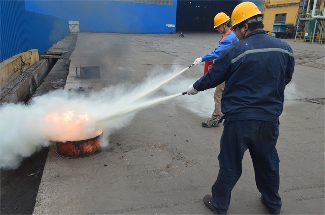 第二、由轧钢厂安全科长郑小凯和炼铁安全科长郭耀方分别对干粉灭火器、二氧化碳灭火器、推车式灭火器的使用方法做出正确示范。现场演示灭火器使用的操作流程,根据不同的灭火器种类和燃烧介质进行了灭火扑救。