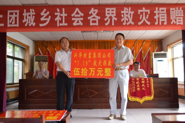 8月3日上午,兴华财富集团董事长陈茂春、总经理付新岗出席上团城乡政府抗洪救灾捐款仪式,向上团城乡捐款50万元。上团城乡党委书记吴秀其代表乡党委、乡政府及2万多名受灾群众对兴华财富集团公司慷慨解囊、爱心捐助表示衷心的感谢。陈茂春董事长在讲话中说,兴华钢铁公司在乡党委、政府和周边村庄群众的支持和帮助下,已走过17年的发展历程,7.19洪灾也给兴华钢铁公司造成很大经济损失,灾情发生后,公司全力开展自救,恢复生产。同时对周边村庄受灾群众的生活也十分牵挂,在全集团迅速掀起送温暖、献爱心捐赠活动高潮,竭尽所能,积极投身全市抗洪救灾行动中,为灾区民众渡过难关提供支持,共同夺取抗洪救灾攻坚战的全面胜利,让灾区群众早日重建美好家园。