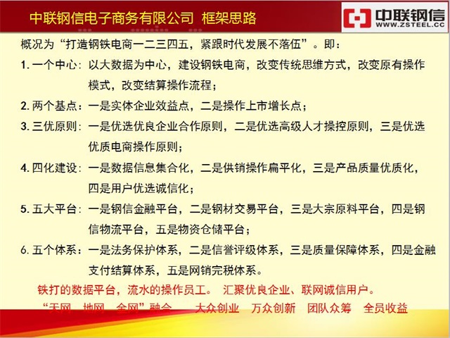 钢铁行业要发展,必须要变革,改变传统思维、改变操作模式,改变结算流程,加快拥抱互联网的步伐,迈入“物联网电商时代”!为了解决钢铁行业的痛点和难点,兴华财富集团联合五家实体企业建设中联钢信电商平台,经过一年来实地考察调研,提出“打造钢铁电商一二三四五,紧跟时代发展不落伍”。