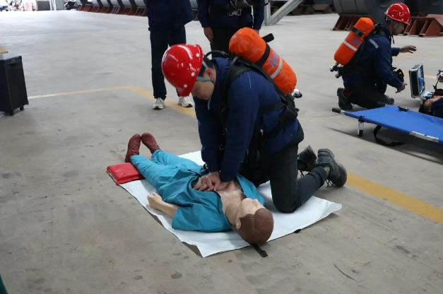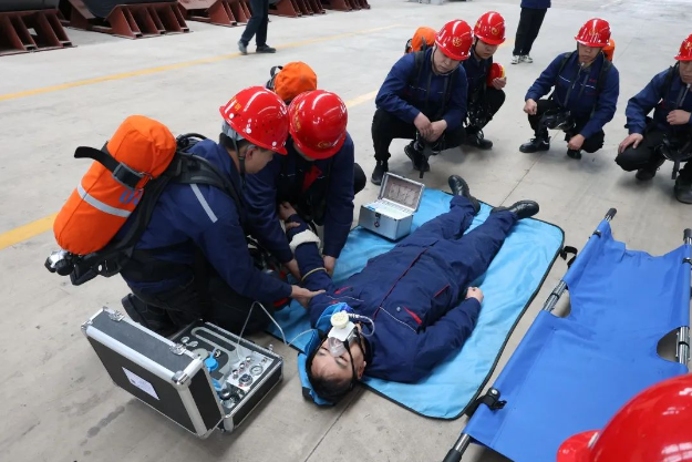 演练模拟了某车间因煤气泄露导致员工晕倒并可能伴有外伤的复合型事故场景。随着总指挥的一声令下,应急指挥部迅速响应,启动了应急预案,各救援小组立即集结到位。医疗救护组首先对晕倒员工进行了紧急救治,确认其生命体征并准备转运;消防警戒组迅速设置了警戒线,有效疏散了人群;抢修堵漏组则佩戴专业装备,迅速定位煤气泄露点并着手抢修。整个演练过程中,各小组协同作战,紧张而有序,确保了救援行动的每一个环节都紧密衔接,演练过程高效流畅。